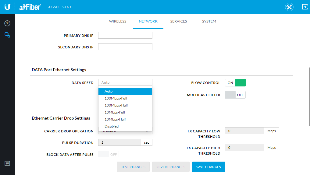 Estou com um enlace de AirFiber AF-5U e a mesma não mostra a opcao de 1Gbps na configuração da porta de rede. Ja foi verificado o cabo de rede (30cm de comprimento, cat 6 e RJ-45 blindado) e não libera a opcao de 1Gbps ficando só 100Mbps.