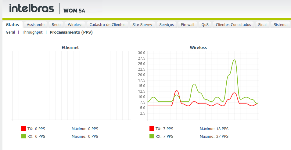 Gostaria de uma ajuda com minha WOM 5a, tenho duas conectadas em modo bridge para mandar um sinal de internet a 30m de distância. O problema que está ocorrendo é que depois de um certo tempo, o RX do ethernet fica zerado como mostrado nessa imagem.