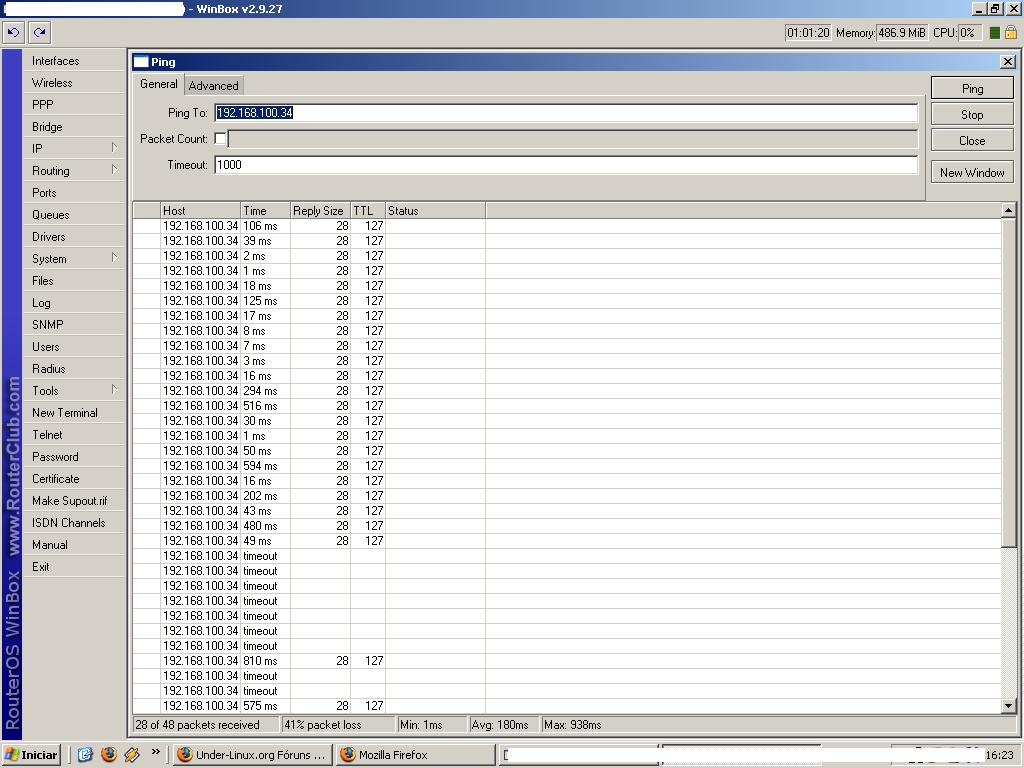 foto1: teste em bancada com 1 cliente conectado e btest sem limitação de banda (ping sem btest dá <1ms todos os pings)