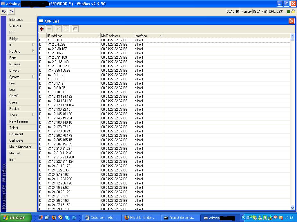 Estou desde ontem com um problema nesse servidor MK versão 2.9.50, hj de manhã troquei ele por uma versão 3.0 para resolver um problema de NAT, ( tenho um topico aberto pedindo ajuda https://under-linux.org/forums/mikro...sta-legal.html ) mas não resolveu e retornei a antiga mesmo. Agora a pouco vou na tabela ARP e olhem tem um MAC na ether1 fazendo misserias na minha rede, como eu faço para bloquear esse MAC pois ele é de fora de minha rede.