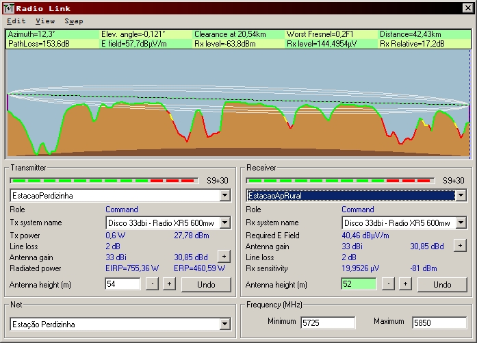 Pessoal, precisamos fazer um enlace pra uma empresa, e fizemos o cálculo pelo radio mobile, segue abaixo a analise do mesmo. Gostariamos de saber se poderemos passar no mínimo 1 Mb neste enlace com segurança.