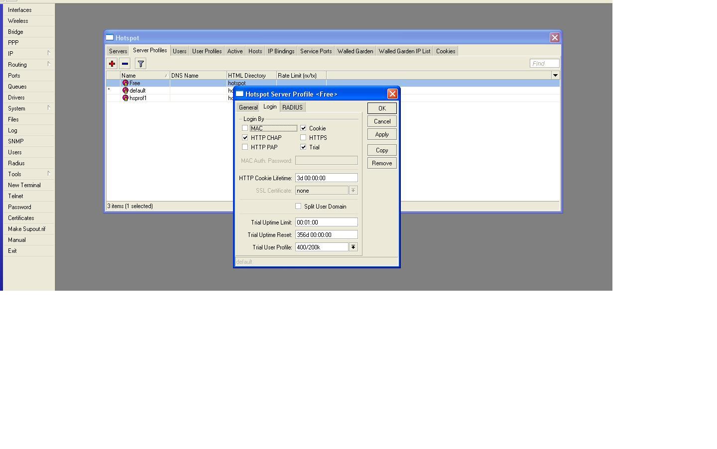 Estou tentando fazer que na tela de meu login apareça trial para quem ver a tela de login navegar sem autenticar,para ver o serviço dai me procurar para ser cadastrado mas não estou conseguindo fazer aparecer,crio lá em hotspot,profiles e marco a opção trial mas na hora que eu faço login nao aparece nada,alguem tem alguma luz,ai esta a imagem de como fiz.