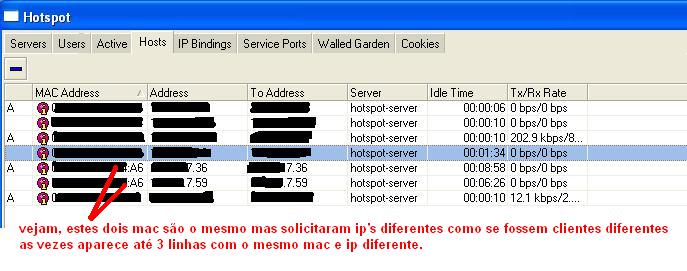 -Galera é o seguinte, andei verificando uma coisa estranha no /ip hotspot host onde se verifica o mac e ip de quem esta ativo ou nao no momento na rede, então lá esta acontecendo uma coisa estranha que nunca tinha visto, quando um cliente loga, o certo seria ele receber automaticamente o ip para seguir em diante só que notei que por ex.: 01:02:03:ab:cd:ef recebeu um ip mas na mesma lista consta este mesmo mac mais umas 2x com ip diferente mas sem o "A" de ativo com isso ocupando ip sem nescessidade, e pelo jeito quando acontece isso o cliente não navega, tenho que derrubar os mac's iguais ai sim quando ele entra ja sai navegando.