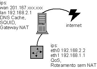 Da mesma forma, não podemos colocar o Squid neste roteador, pois o controle de tráfego não conseguiria identificar individualmente os pacotes enviados pelo squid, pareceriam todos do roteador, então este deve estar em um servidor independente (separado).