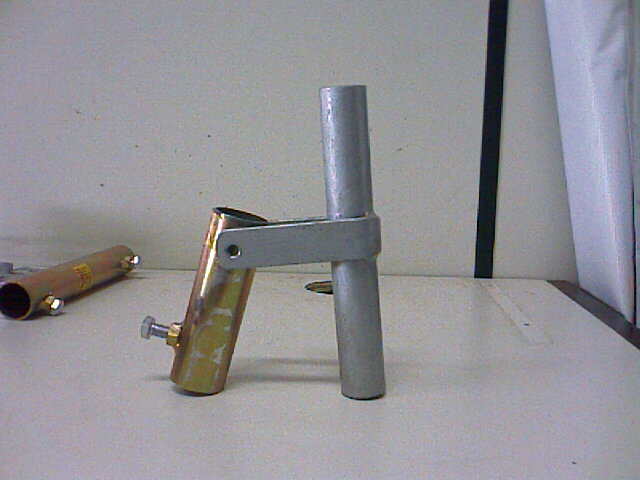 Precisamos de uma chapa dobrada, um pedaço de cano de 15 cm, e uma emenda para canos, essa emenda dá para se fazer dois suportes. O suporte sai pronto do provedor, é universal, conseguimos ter alinhamento para a base e também, usamos duas abraçadeiras de aço, pois aquela original do equipamento resseca e quebra. A emenda, podemos usar tanto para canos de 1" ou 3/4, no nosso caso é 3/4.