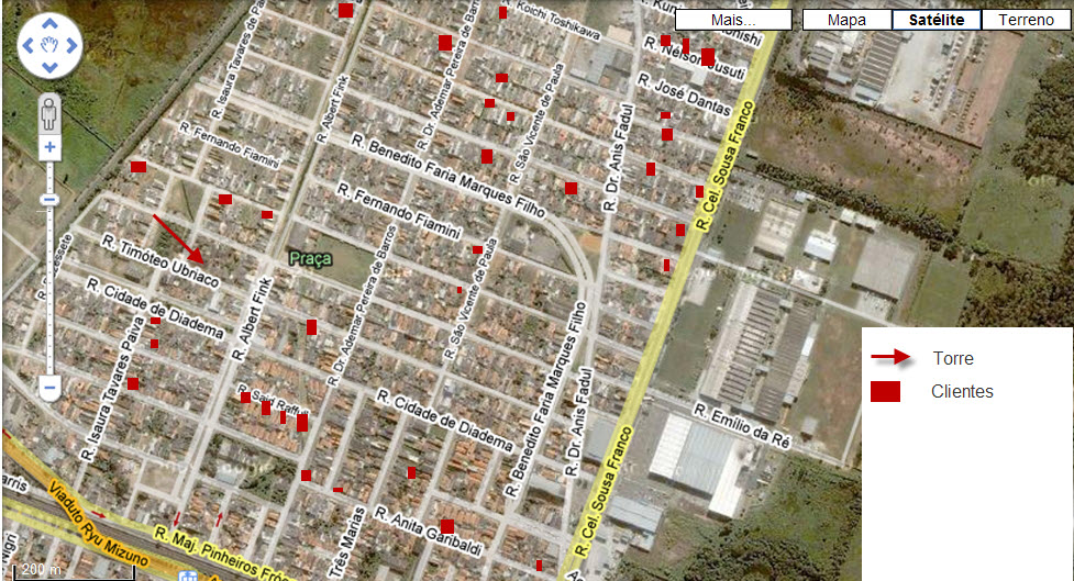 Postei um Mapa de meu bairro, ele é 100% plano, sem prédios, apenas casas e sobrados. neste mapa não consta os clientes mais distantes, mesmo assim os que estão há uns 400/500 Mts o sinal oscila bastante.