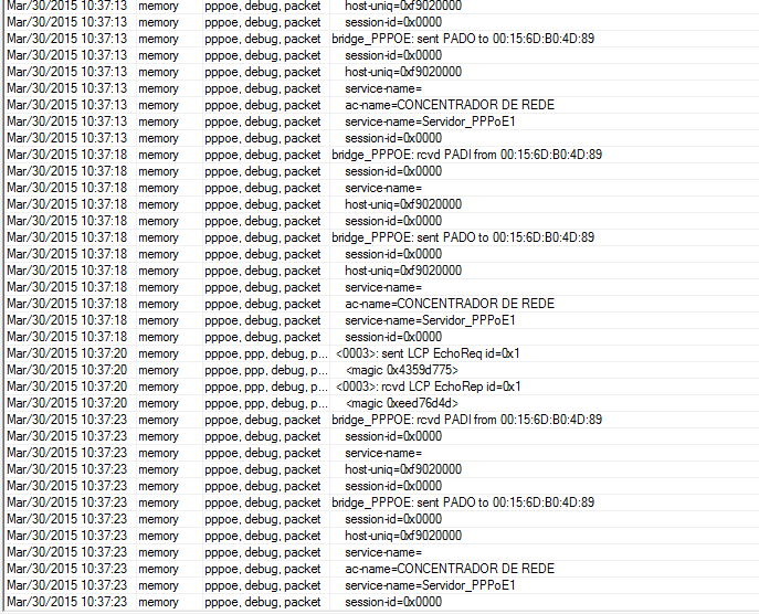 Segue o log do mikrotik quando é colocado o pppoe em cima da bridgeClique na imagem para uma versão maior