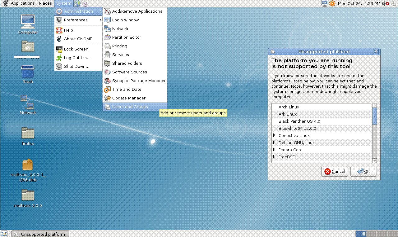 Seguinte to querendo usar ali a ferramenta do System - Administration - Users And Groups porém como a imagem em anexo ele da uma mensagel dizendo que a Plataforma não suporta esta operação mas que posso selecionar o sistema operacional e continuar porém pode danificar o meu dados hehe