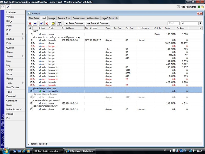 Amigos, preciso de uma ajuda de voces se posivel, uso um pc com Mikrotik 3.22 rodando, mas em uma bronca em minha placa mae tive que substitui-la, e meu proxy rodava tranquilo e depois da traca da placa mae notei que nao ta funfando e essas regras de firewal nat estao assim...veja a imagem.