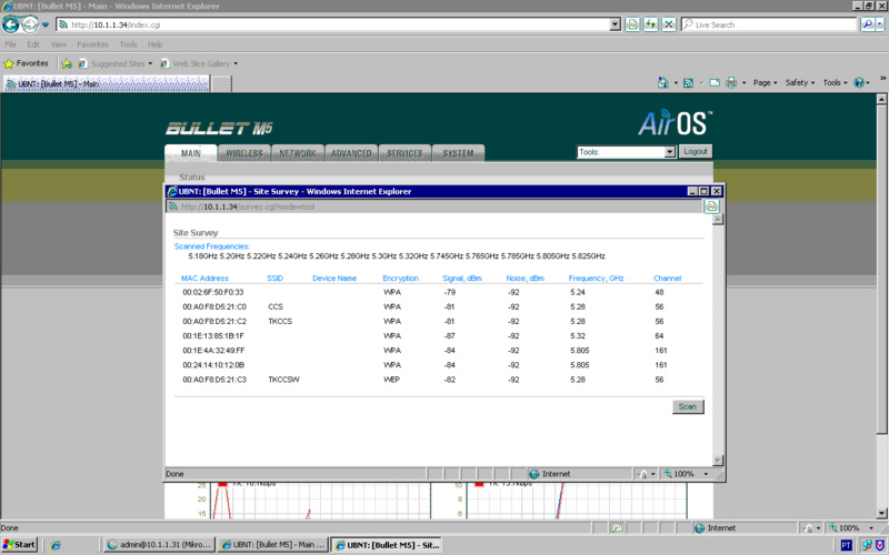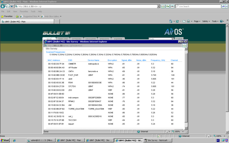 Seguem informações sobre o projeto wireless executado com os Bullets M5 no último sábado (30/01/2010). Imagens de Teste de Banda e Site Survey nos dois pontos.