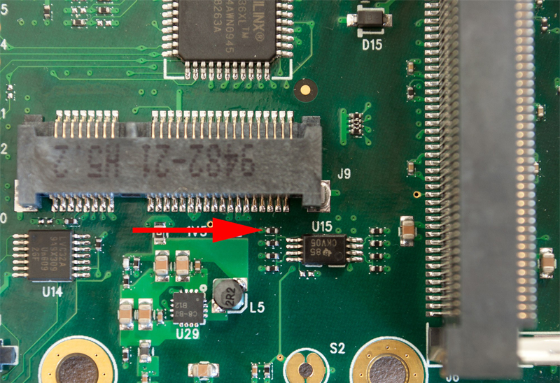 Retire o Resistor conforme a figura, e conecto com um fio e um resistor 22 Ohm 0402 no pino 7 do U15. conforme figura abaixo.
