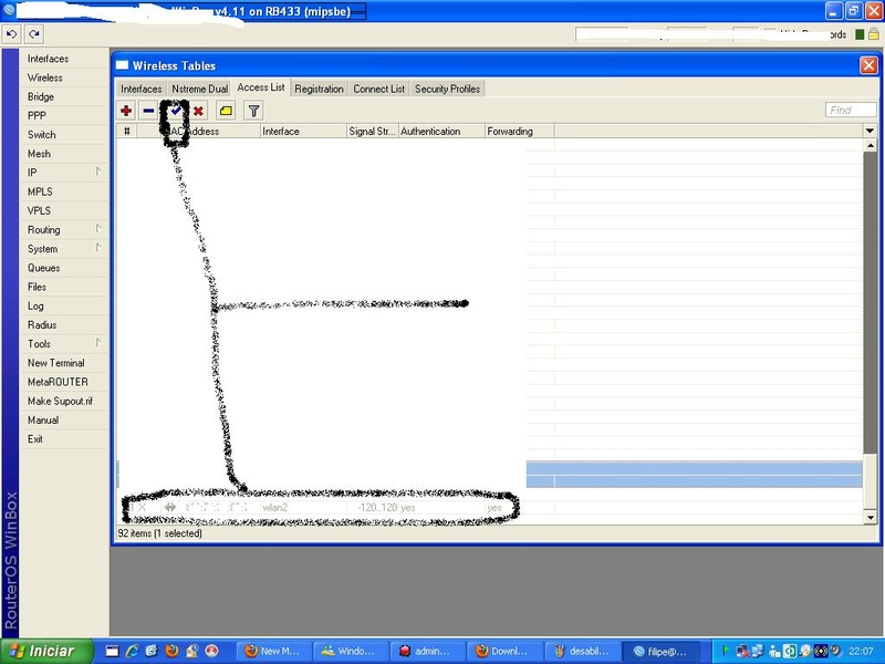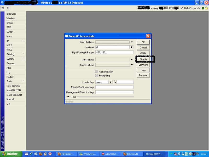 Boa tarde!! Caros amigos, estou com problema em 2 Rb's que comprei a pouco tempo, elas possuem a versão mk4.5 , e toda vez que adciono cliente na Wirelles acess list ele ao habilitar ele derruba todos os clientes que ja estão conectado alguem ja passou por isso. Abraços a todos.