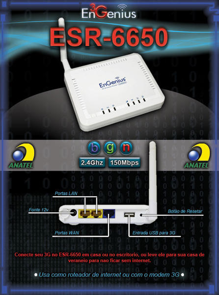 Ola Pessoal, Saiu a Homologação do nosso roteador 3G - ESR-6650. Fizemos os testes com modems mais conhecidos (Vivo, TIM, Claro, OI) e funcionaram perfeitamente.