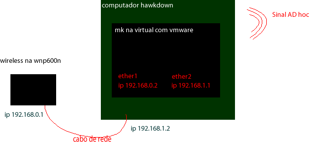 Oi gente.... td bem?? sei que vcs são craques no mikrotik, e gostaria de uma ajuda se possivel. Estou com o mikrotik 3.30 rodando com licenca nivel 4, até aí tudo bem. Utilizo aqui uma placa de rede wireless PCI e uma USB da realtek. Distribuo a internet para o notebook da minha irma através da placa da realtek. Utilizo Rede Ad-hoc do proprio windows 7. Gostaria de saber como configurar minha rede no mikrotic para que a placa que recebo a internet wireless seja a de entrada e a Realtek USB de saida.... nao consigo botar pra funcionar nem a pau....rsrsr gostaria de fazer posterior a isso um cache legalzinho. Utilizo internet de 15Mb dedicado. Obrigado gente.