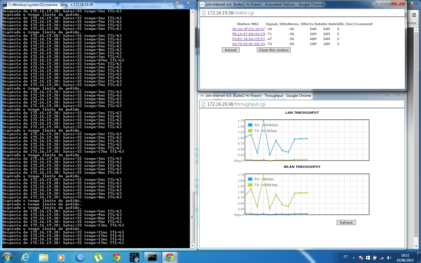 ID:      	59780boa tarde pessoal!venho mais uma vez compartilhar um obstaculo com os amigos provedores!ainda sou iniciante no ramo de rede wireless,tenho pouco menos de 2 anos de experiencia no ramo!e a um tempo venho me deparando com esse carinha fazendo isso ai!eu estou conectado nesse aparelho como cliente!o radio esta travado em G,e tentei fixar também a banda em 11,18,24,48 ou 54!sinceramente não consegui notar nenhuma diferença!na imagem consta o throughput e os clientes do aparelho!sei que esses clientes em 70+ ai não é exatamente recomendado!porem dia o radio consegue trafegar 6,ate 8mb/s sem nenhum problema!porem tem dias que ele trava completamente a navegação!vi alguma coisa na net em relação a fixar a distancia e o acktime!porem também não obtive melhoras!qualquer ideia sera muito bem vinda!e peço desculpas caso eu esteja cometendo um erro grotesco aqui!