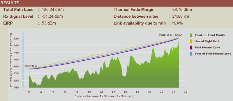 Olá amigos, sou novo no fórum, e gostaria de pedir a ajuda do pessoal para saber a viabilidade de um projeto para uso próprio. Eu resido na zona rural de Mairinque, e cansei de sofrer com a falta de estrutura para internet aqui na região. Tenho familiares que moram em Sorocaba (prox daqui), e lá tem oferta de Speedy, Net, Virtua, a preços acessiveis. A minha idéia é montar um ponto a ponto entre uma residência em Sorocaba (onde teria o link de internet), e minha casa aqui na zona rural. Eu realizei um teste pelo radio mobile, e pelo google earth, e aparentemente tem visada, mas com distância aproximada de 25KM. Como sou novo no assunto, gostaria de pedir a ajuda de vcs para saber a viabilidade do projeto.