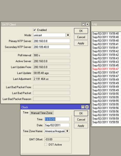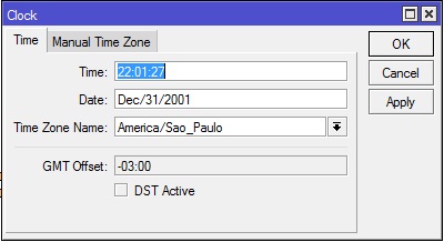 Engraçado, se eu ativo o NTP Server a hora fica certa, mas se eu reinicio a rb ela não se acerta fica com a data de 2001, agora se reiniciando com o ntp server ativado e desativo ela, ela automaticamente se acerta e vice e versa.