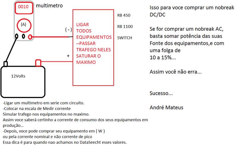 Ou seja, Watt já é o valor utilizado para você saber o consumo independente da voltagem utilizada. Normalmente, nos equipamentos eletro-eletrônicos, a etiqueta de consumo já está expressa em watts. Some os valores, acrescente pelo menos uns 10% de perda (calor, equipamento ruim, etc) e você terá a corrente necessária para alimentar seu no-break. Vamos supor que o total de consumo do seu equipamento seja uns 200 Watts.