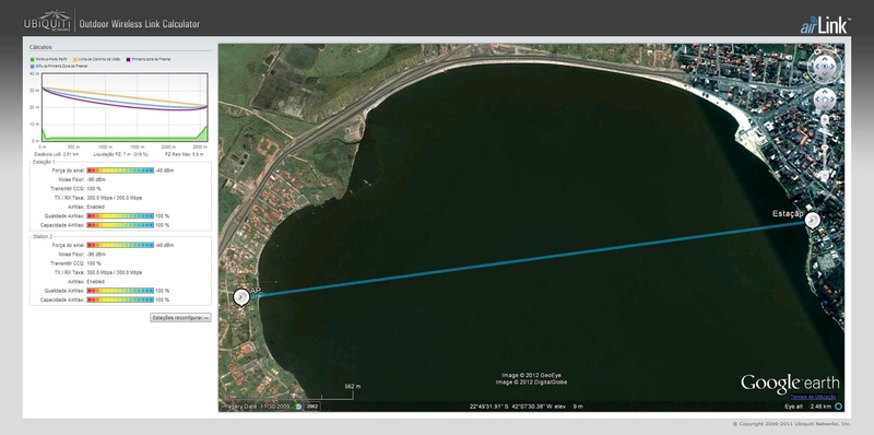 Na simulação de cálculo do site da Ubiquiti AirLink, o resultado foi bem diferente. Mostrou -48 dBm.