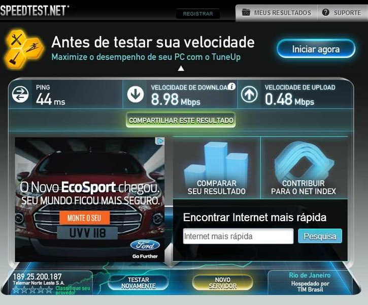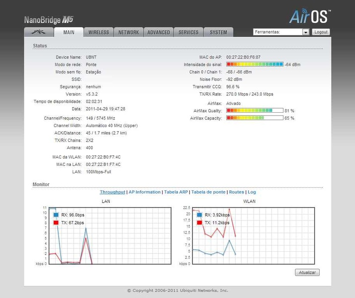 Assinei um Velox de 10 MB do outro lado da cidade, fiz toda a instalação entre Estação e AP e com o enlace já funcionando, mandei o sinal para a minha casa por meio deste enlace. O Ping inicialmente estava em média 2 ms e a medição do Velox pelo Speedtest, deu 9.83 MB, mas depois que começou a trafegar dados da internet neste enlace, o ping passou a variar entre 2ms e 200ms, ficando boa parte do tempo abaixo dos 10ms. Porém, o que acontece é que não estou tendo um bom resultado nesse enlace. Não sei se precisa ser feito alguma modificação nas configurações dos equipamentos, ou se estaria tendo algum problema de obstrução na visada ou até mesmo perda de sinal por parte dos próprios equipamentos (o que eu acho que seja menos provável pelo fato da distância não ser tão grande).