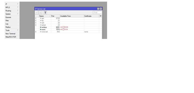 Nesta regra no meu caso quando se trata de equipamento MK eu configure ele para acessar via web por determinada porta de preferencia porta alta em > IP Service >