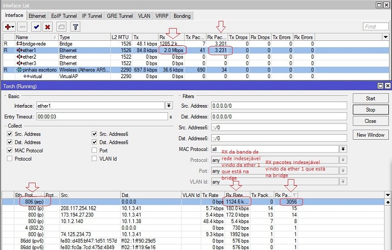 O numero de RX dos pacotes chega a passar de 4000 PP/S na interface de rede de entrada em todas as Bridges de uma vez. Isso acontece inúmeras vezes ao dia, comprometendo até a rede 5.8 que é encarregada dos Ponto a Ponto, pois satura os PPS do enlace.