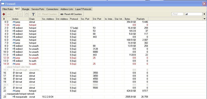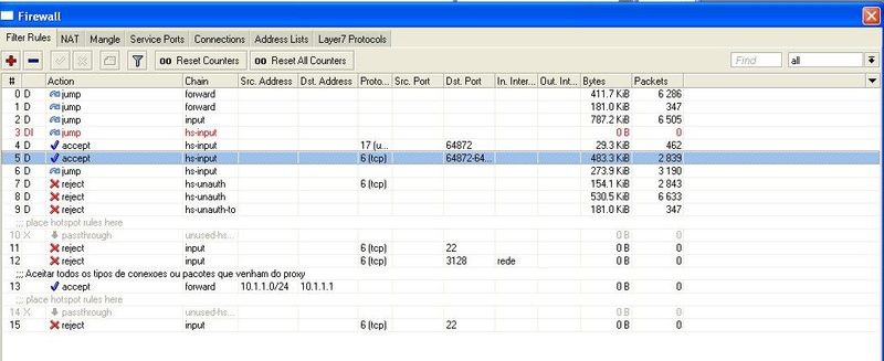 Estou postando minhas regras de firewall. Tem algumas em vermelho. Essas regras, quando excluo, se desativar e ativar o hotspot elas voltam. Não sei para que servem. Pode ser alguma coisa aí... sei lá.