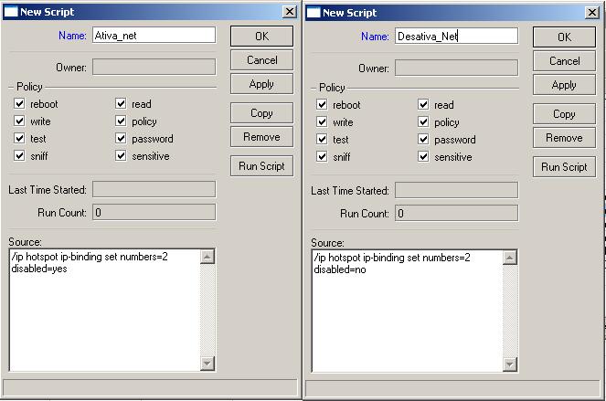 boa tarde! gente eu fiz passo a passo certinho o script até funciona dando informação no log do mk! porem o mac cadastrado no ip binding que deveria ser habilitado e desabilitado nada acontece! poderia me dá uma ajuda o porq não funciona? [email protected]