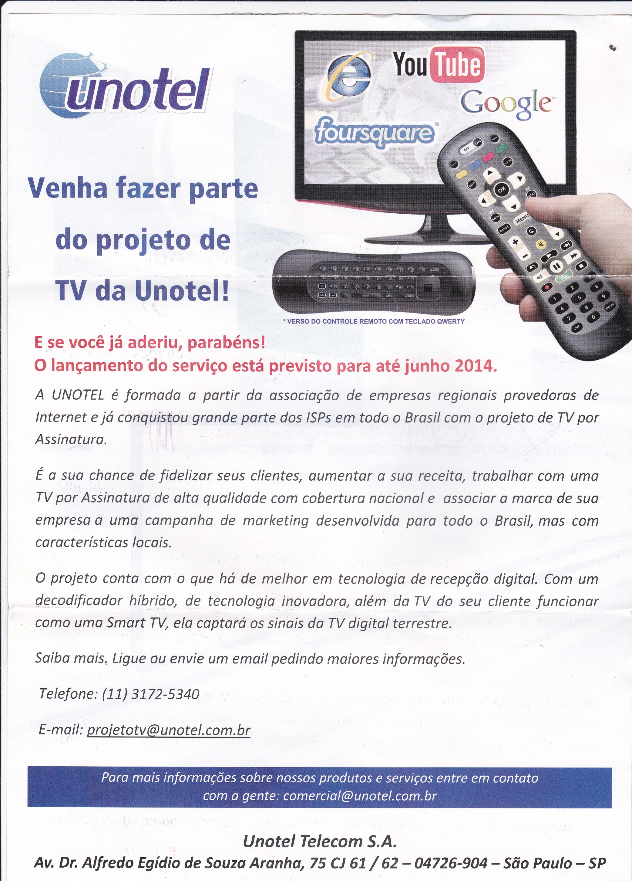 Galera venho aqui perguntar se alguem tem trabalhado em seu provedor com a UNOTEL para poder prover tv juntamente ao provedor, recebi esta carta deles ja tem algum tempo e nao sei se é bom, se alguém já trabalha com eles por favor postar ai sua experiencia, creio que me acharam por motivo do registro da SCM na Anatel . E para quem quer trabalhar com TV ai fica a dica .