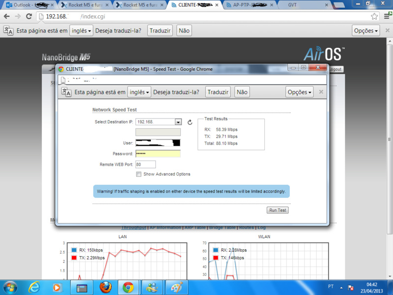 cara teu sinal ta muito ruim, alinha melhor essa antena. com esse sinal ai tu nem consegue navegar. tenho aqui ptp distancia 6km sinal -64 passando 58mega indo e 29mega voltando, com nanobridge 22dbi. potencia em 19dbi