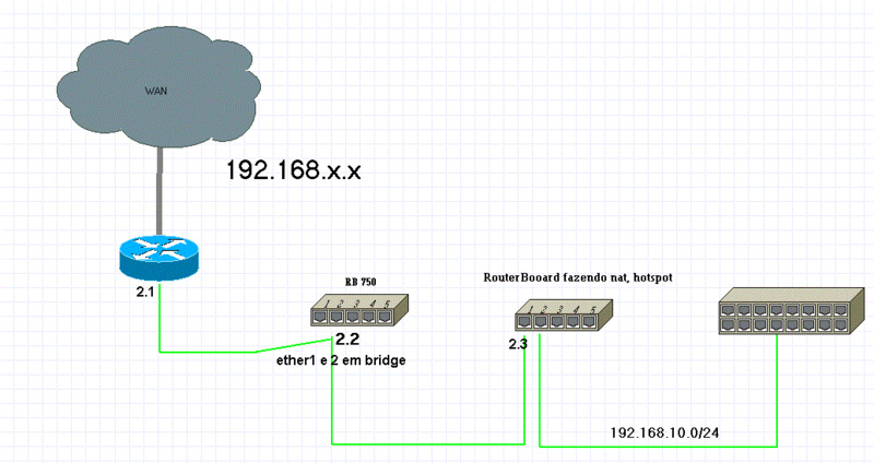 na rb 750 eu coloquei as ether 1 e 2 em bridge, coloquei um Ip a esta bridge e na omnitik(servidor que estava rodando o htspot, mui bien) apontei gateway para 192.168.2.1, funcionou, mas eu não gostaria que fosse, existe maneira mais correta de fazer isso?