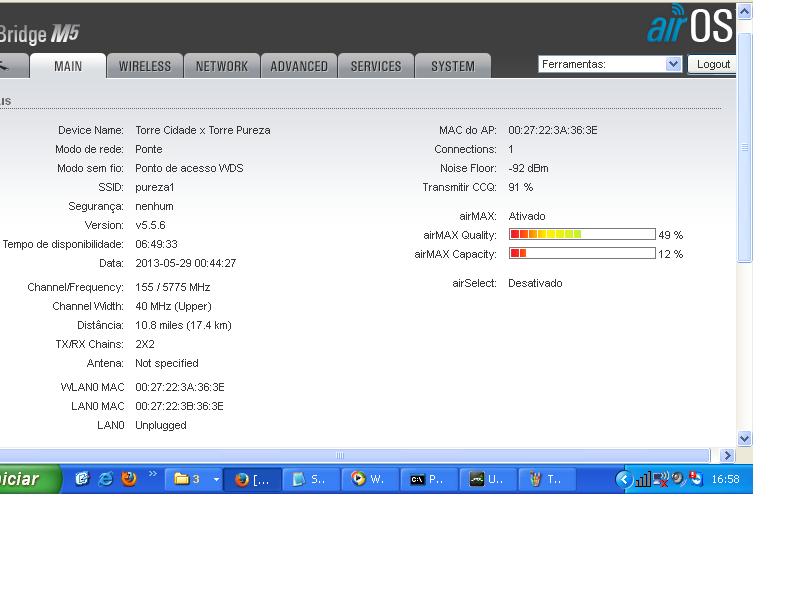 Boa tarde, venho registrar minha experiencia nesse enlace, primeiramente venho dizer que fechei o enlace, entre a cidade e a Fazenda, utilizei duas nanobridge m5 de 22dbi, uma a 30mt na cidade e outra á 30mt na fazenda, realizei o teste de ping ficou variando entre 3 e 5ms, tinha montado a nano na torre da cidade a uns 30 dias atrás, nesse intervalo ouve muitas chuvas e raios e queimou a porta lan, na nanobridge liga normal só que nao dá lan, vou postar umas imagem do ptp.