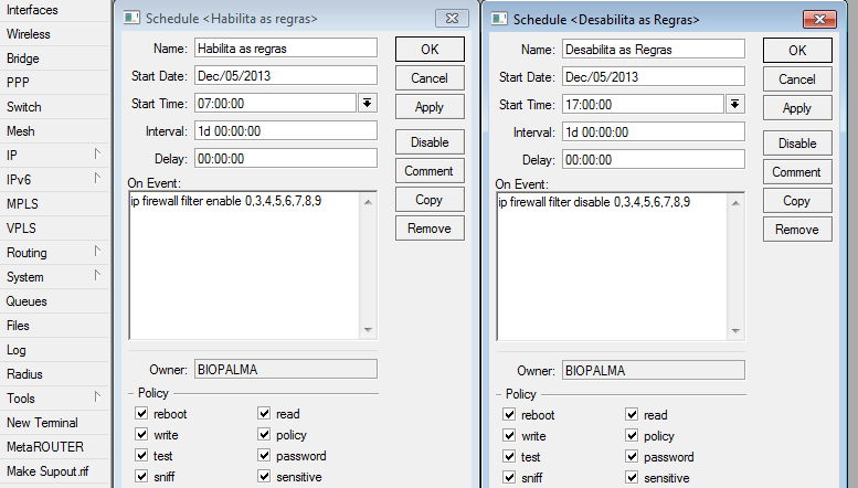 Estou com um problema, trabalho em uma empresa que tem um link corporativo e nessa empresa temos alojamentos que usam esse link e pessoas que usam esse link anoite e nos fins de semana, e tenho algumas regras de bloqueio e uma delas é o facebook, onde esses conteúdos são bloqueados de segunda a sexta das 07:00 às 17:00, até tranquilo eu uso duas regras no SCHEDULAR , uma para habilitar a regra de bloqueio às 07:00 e outra para desabilitar às 17:00 todos os dias, o problema que preciso deixar esse conteúdo livre nos fins de semana, como o intervalo esta para 1d 00:00:00 ele fica funcionando no sábado e domingo, gostaria de saber se tem como fazer esse agendamento apenas de segunda a sexta nesses horários.