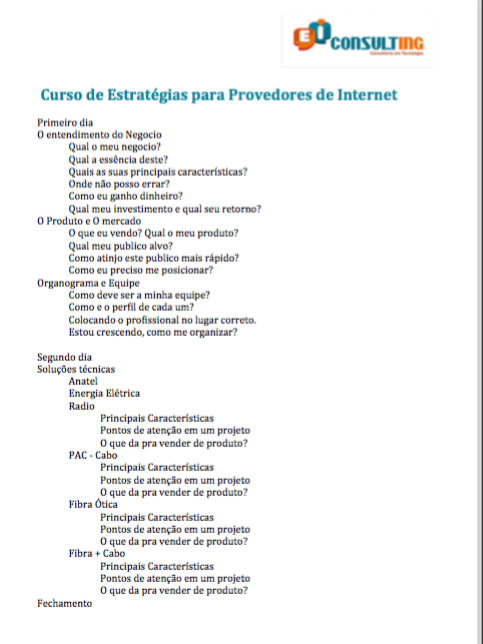 O curso de Estratégias para Provedores de Internet é um curso voltado para o seu negócio. É um curso que possui um conteúdo variado envolvendo a parte administrativa com a parte técnica. Para uma melhor explanação do conteúdo, o mesmo foi dividido em dois blocos: