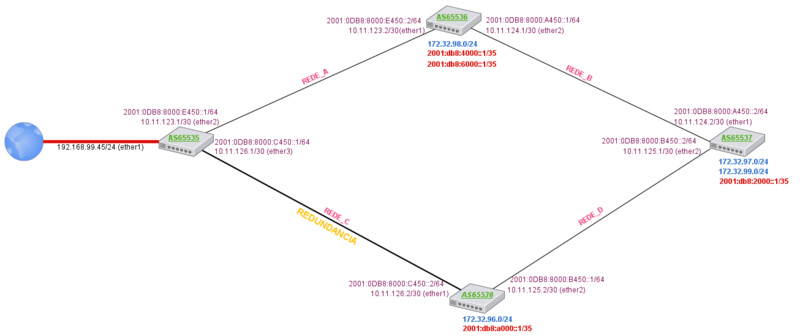 O estudo eh bem fácil. São 4 roteadores Mikrotik virtualizados no VirtualBox, fechando sessões bgp entre si e fazendo anúncios de blocos. IpV4 e IpV6.