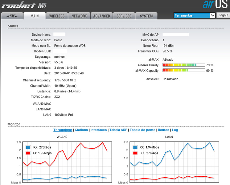 Domingo passado esse rocket (o AP) deu problema na lan eu conectava nele daqui mas não conectava nos outros equipamentos que estava apos o switch, então reiniciei ele e voltou a funcionar.