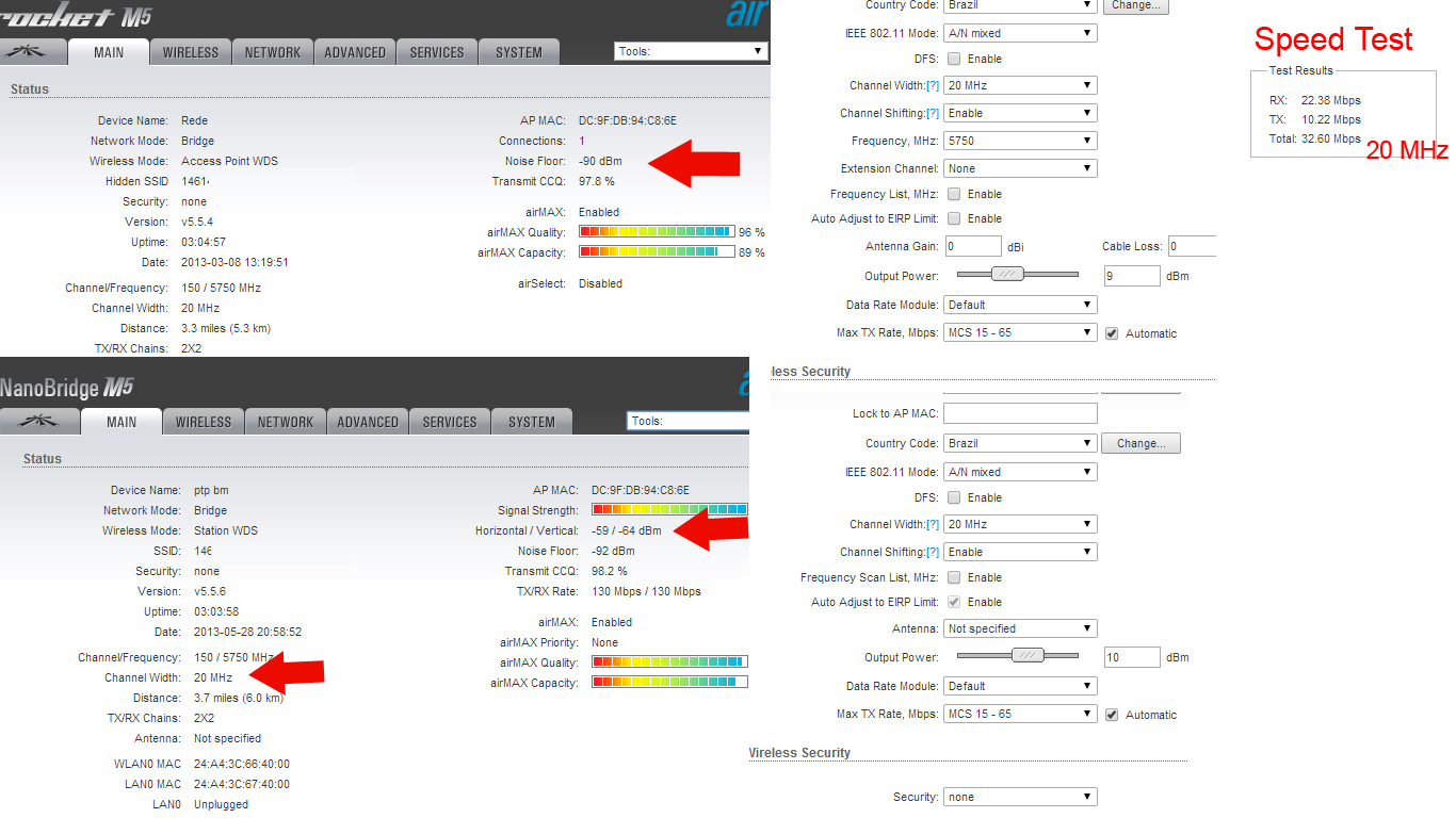 Pelo noise seu indica ter uma possibilidade de canal saturado, faça um scan em sua rede, e se tiver o firmware 5.5.6 mude para complient (apenas para o scan) e depois retorne para Brasil. Voce verá muitas outras frequencias em uso. faça o scan em ambos os pontos, pois voce terá que selecionar o canal de menor uso.