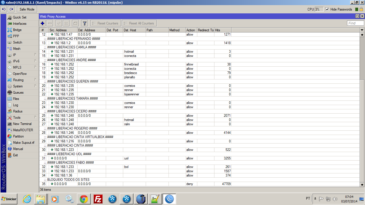 Se tiver travando, você precisa ir na em firewall e desativar a regra com o comentario "BLOQUEIO WEBPROXY", pois é um bug do sistema routerOS.