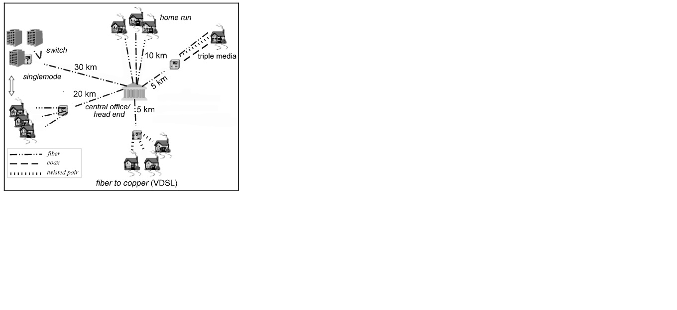 Conjunto residencias Extremo inferior esquerdo : pode ser varias arquitetura em FO, Fiber to Home, Fiber to the Curb, PON, etc.