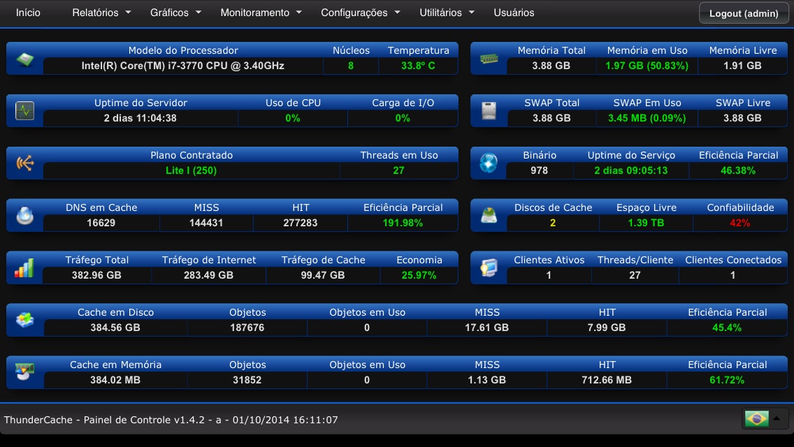O meu tenho em um i7 com 4gb de RAM, mas tenho um xeon server que uso outras coisas ai tive ai idéia de colocar o cachê no server mas enfim vi que é uma má ideia, deixo uma imagem do meu tundercache ele está com a economia boa ai na imagem mas o normal dele e de 25~32% e que não tenho muitos gb no cachê, e tenho poucos clientes