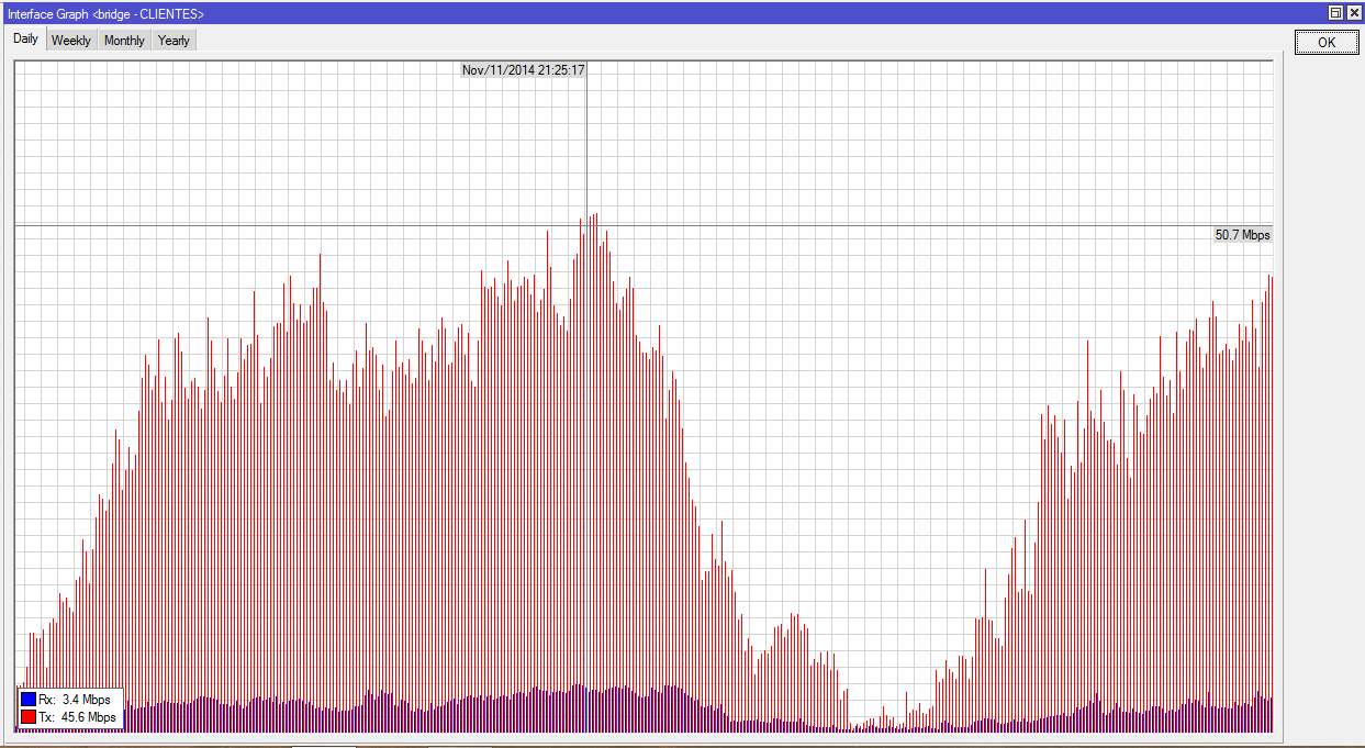 Santiago quantos cliente simultaneos usando? Aqui tenho em hr de pico cerca de 220 conectados e uma media 80 a 90 ativos trafego entre 20 a 25mb. Tenho um dedicado de 30mb, planos desde 300k a 2mb