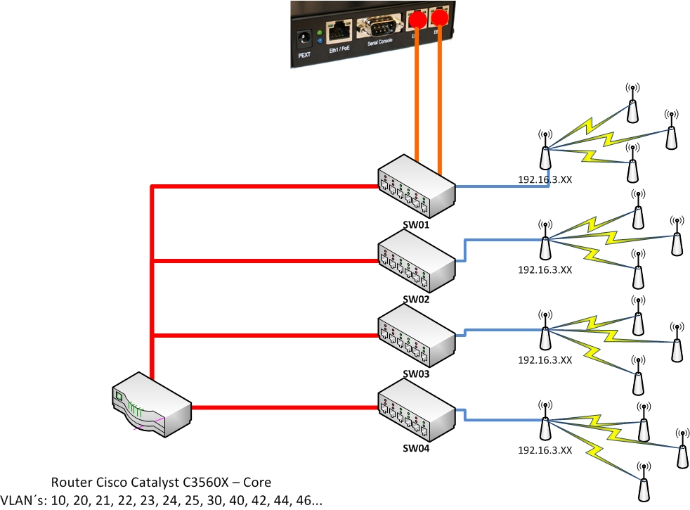 Em cada um destes locais tenho uma media de 50~60 rádios entre nanobridge, rocket, RB... Totalizando aproximadamente 220~240 radios.