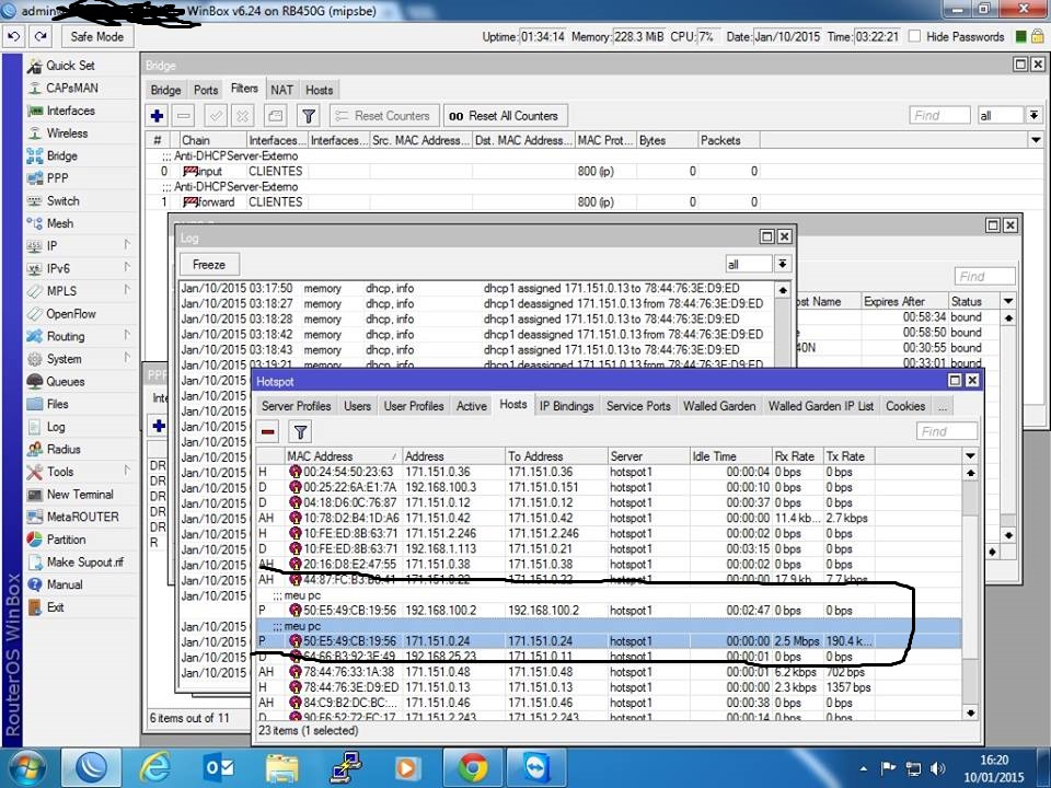 Pessoal estou com o seguinte problema. Minha rede RB450G em bridge funciona tranquilo hotspot e ppoe. O problema é que se um cliente usando o roteador em ppoe pegar o cabo e colocar na Lan a rede pára pegando o ip do roteador. Teve cliente que pegou um Modem e conectou para usar o wifi eu falei meu filho compre um roteador e me chame para configurar.