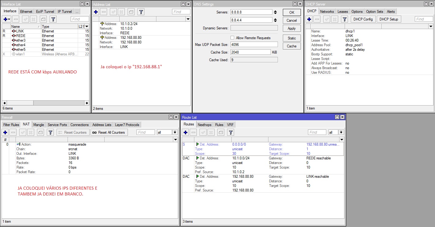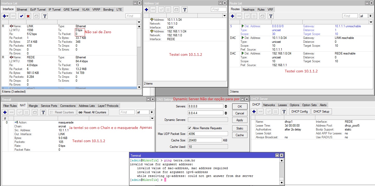 Pessoal ja assisti muitas aulas,vi alguns tutoriais;Mais não estou conseguindo configurar o mikrotik Ou seja!Colocar internet com modem roteado.Alguém pode me ajudar por favor?Nas Aulas que assisto uns falam uma coisa outros outra,mais até agora não encontrei o problema.Será nessário algumas aulas de rede?"A intenção era aprender sobre redes usando mikrotik"Abaixo tem uma imagem para vocês analisarem e ver se encontra algo que me ajude.
