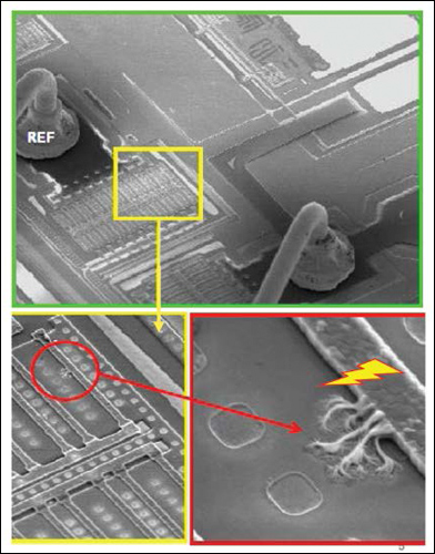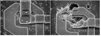 E como são "filamentos" e "trilhas" e nanometros de tamanho (Cabelo tem 100 MIL nanometros), uma alta tensão induzida quando esse material está quente rompe algumas, ou só rompe ou rompe e move o material metálico pra outra trilha dando curto, algo tipo: