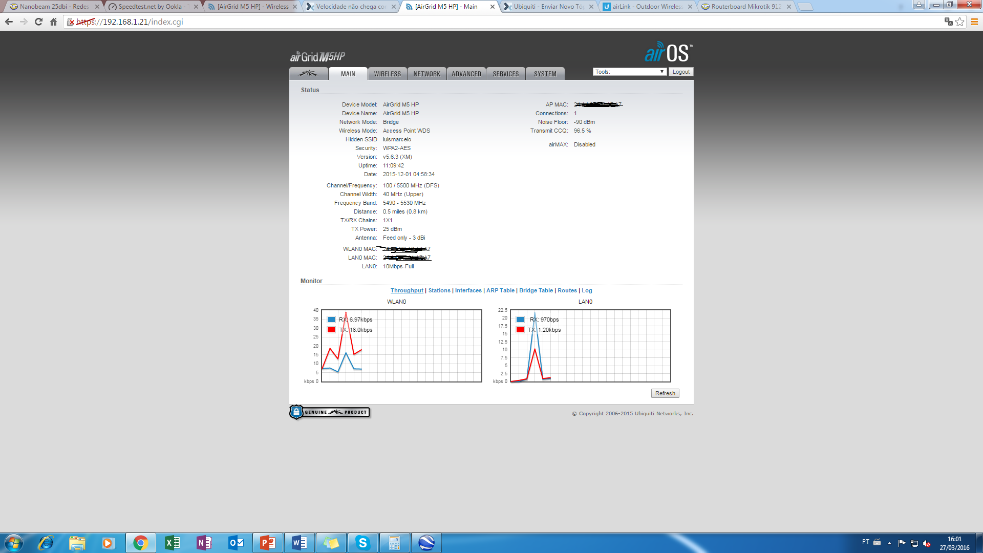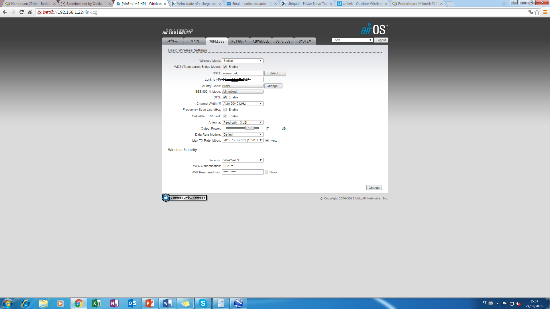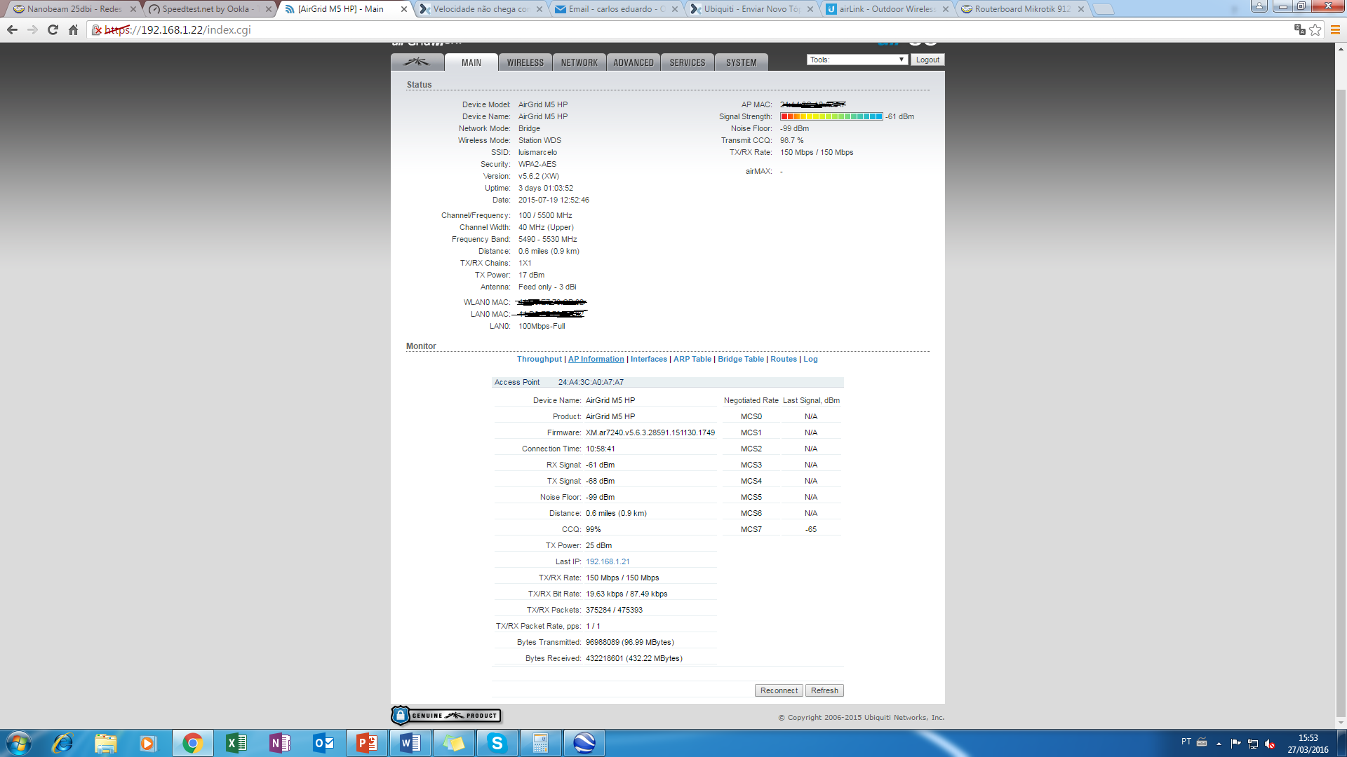Configurei 2 Airgrid m5hp 23dbi um como ap outro na minha casa como Station, mas não estou conseguindo obter uma boa velocidade não consigo mais de 10mb de navegação em casa. ai é o print da minha statione aqui é da minha ap