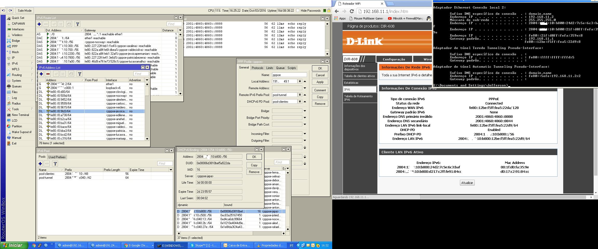 O problema é o seguinte qualquer roteador que eu coloco na rede “PPPOE”, ele pega o DHCP e o PD.. atribui na minha maquina, só que não pingo e não tenho acesso a ipv6,