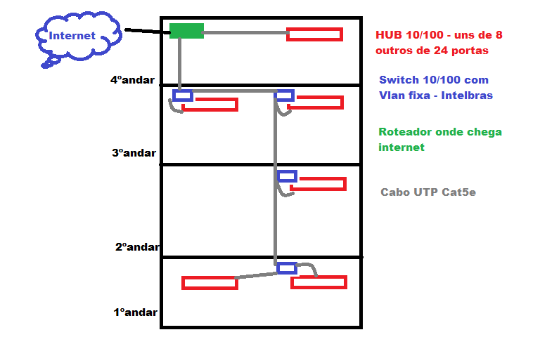 Olá amigos do fórum, essa semana fui visitar uma empresa onde o dono e meu amigo. Ele sabe que eu gosto de redes então veio logo falando que estava tendo um problema na empresa dele, quando terminamos de colocar a conversa em dia fui ver oque podia estar acontecendo por curiosidade. Foi ai que me deparei com vários HUBs de rede ligados em cascata. Serviço mal feito por eles mesmo.