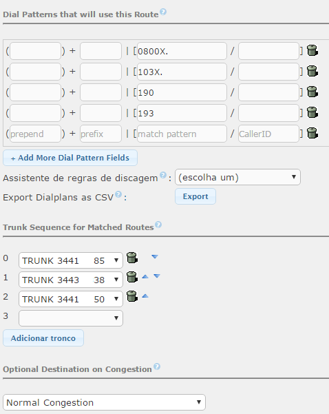 Nas rotas de saída tenho três regras, 1ª Ligação para telefones fixo, 2ª para celular e uma terceira para serviços (0800, 190..)