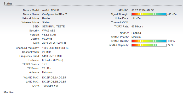 Muda o AP pra MCS7, e desativa o chain1, pra ver se o Airmax Quality não cai pra 48-50%. Por mais que ele exiba 1x1, é igual a exibição de nível de sinal: Mais mentirosa que tudo no mundo! -48dBm é nível da modulação double-bpsk com SSID e cia, na modulação com pacotes de dados deve ter -51dBm.